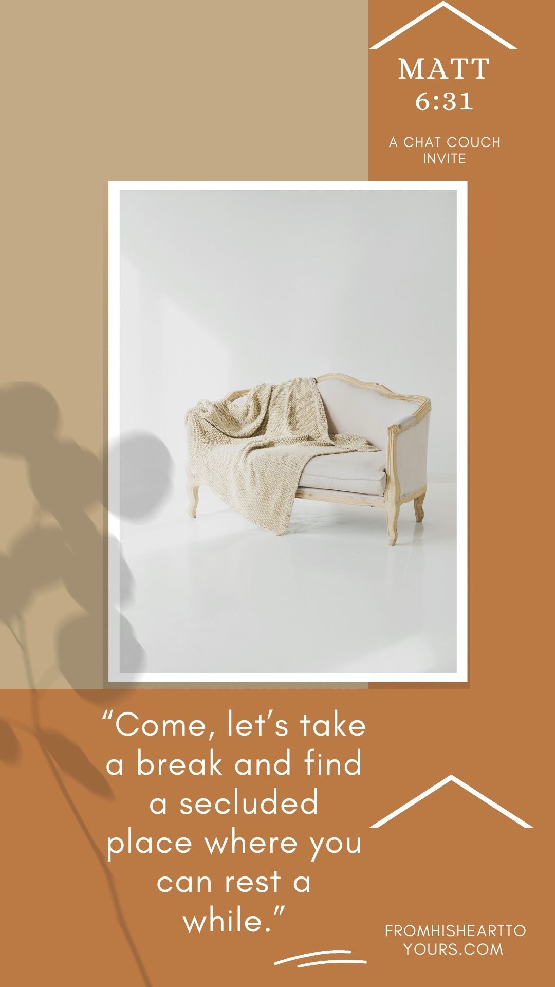 Today I encourage you to change your perspective. Look at things differently around you. Find creative ways to commune with the Lord. Once you re-discover, re-invent and re-establish your very own ‘ Chat Couch’ with Him, He will lead you and guide you through whatever mountain or challenge is trying to intimidate you or cause you to fear. It is time to re-connect with Him and take your place as His child. That’s where your strength for the journey ahead lies.