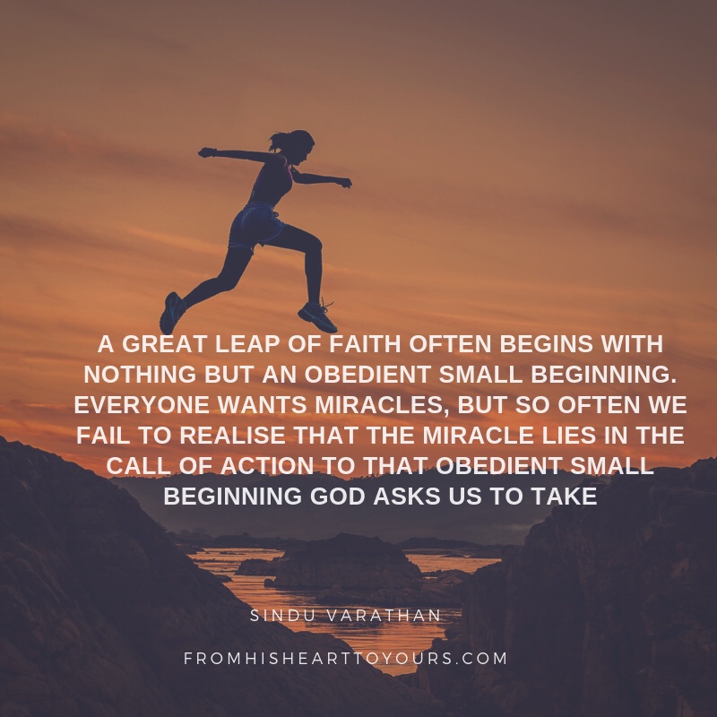 A call for obedience ! Been praying about something and wonder why nothing is happening ? Probably you are missing that gentle whisper of God to take a leap of faith, thinking the beginning is small or insignificant. Here’s a reminder for you that God is with you, every step of the way. YOU ARE NOT ALONE . He wants you to take a leap of faith, trusting Him with your small beginnings.